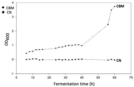Growth curve of B. megaterium LVN01 in Biogas digestate (CBM, circles); negative control: medium with digestate (CN, diamonds); operational conditions: 3L, 400 rpm, 30.8 °C, pH 7.