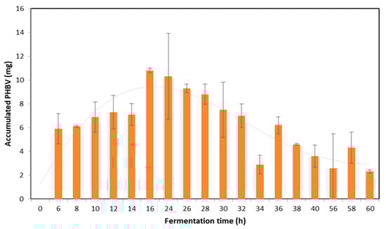 PHBV accumulated by B. megaterium LVN01 using biogas digestate as a function of fermentation time expressed in hours (h). (V: 3 L; t: 60 h, 400 rpm; T: 30.8 °C, pH 7.0). The dotted line shows the accumulation trend of PHBV during fermentation.