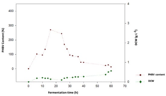 The optimal performance of B. megaterium LVN01 in the digestate occurred at 16 h, with a PHB yield of 2.7 g PHB g cell−1 (270%) and a DCW of 0.133 g L−1 (Figure 3). The maximum values of DCW = 0.563 g L−, reached at 60 h in the fermentation process of B. megaterium with digestate (Figure 3), contrast with the maximum production yield of PHA (360 mg PHBV L−1) observed at 16 h of the process. An inverse trend can be observed between biomass and PHBV production (Figure 4).