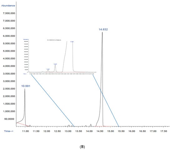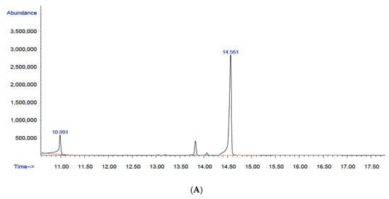 Furthermore, another peak is observed at 10.991 min, which represents the internal standard used in the analysis, i.e., benzoic acid ester. The presence of this internal standard is essential to guarantee the precision of the quantification and the consistency of the results.