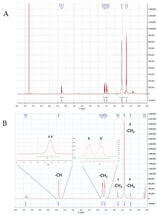 1H-NMR spectrum of PHBV synthesized by B. megaterium from biogas digestate (batch fermentation), showing the chemical shift of the characteristic functional groups: (A) commercial standard (Figure S7(A1–A3)); (B) synthesized by Bacillus megaterium (Figure S7(B1,B2)).