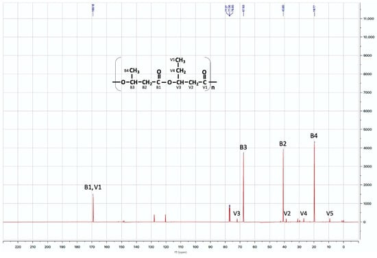 The 13C-NMR spectrum (Figure 8) shows the chemical shifts of the signals corresponding to the different types of carbon atoms present in the structure of the biopolymer obtained through the fermentation of B. megaterium LVN01. By comparing these signals (C=O δ 169.18 ppm; CH δ 67.63 ppm; CH2 δ 40.80 ppm; and CH3 δ 19.77 ppm) with those of the commercial PHBV spectrum and those reported by other authors for PHB [24,33], it can be inferred that B. megaterium LVN01 accumulates mostly PHB, which has significant implications in various biotechnological and environmental applications.