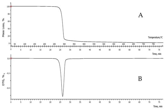 The thermal stability of the obtained biopolymer was determined through thermogravimetric analysis. Based on the thermogravimetric (TG) and derivative (DTG) curves (Figure 9), it is inferred that the obtained PHBV exhibits a single stage of decomposition under a continuous and uniform process. The TG curve profile (Figure 9A) indicates that it is a thermally stable copolymer in the temperature range of 35.0–254.540 °C, reaching a Td 1% of 266.2 °C (the temperature at which a weight loss of 1% occurs) at 23.58 min. It continues with minor mass losses over time, until reaching a Td 10% of 280.9 °C (t = 25.08 min). Subsequently, the material begins to degrade, with an initial decomposition temperature Td (Tonset) of 283.1 °C and a final decomposition temperature (Tendset) of 296.98 °C. In this temperature range, and in just 2 min, the compound loses about 72% of its weight, with a maximum Td of 290.114 °C, at which the maximum decomposition rate is reached (Figure 9B). In the Tendset, a weight loss of 86% is observed, and approximately 90% of the mass is lost in the temperature range of 253.376 °C to 308.084 °C.
