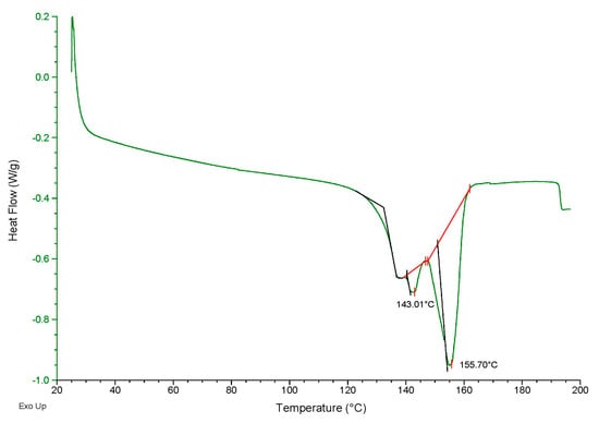 The DSC analysis of the biopolymer synthesized by B. megaterium LVN01 from the biogas digestate revealed three exothermic thermal events (Figure 10). The two most significant have melting temperatures of Tm1 = 143.01 °C and Tm2 = °C 155.7 °C and fusion enthalpies of (ΔHf) = 1.541 J g−1 and (ΔHf) = 19.80 J g−1. These results agree with those of other studies; for example, Abbasi et al. [38] obtained PHBV via the fermentation of dairy manure with mixed microbial consortia (MMC), with 3HV contents between 16% and 24%, and reported that some of the extracted PHBV showed two melting temperatures (Tm); the lowest Tm1 ranged between 126.1 °C and 159.7 °C, and the highest Tm2 varied between 152.1 °C and 170.1 °C.