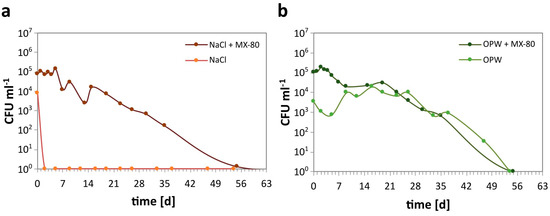 Similar to NaCl, the CFU number in OPW with MX-80 bentonite steadily decreased from 105 to 0 within 55 days (Figure 2b). Contrary to the NaCl mesocosms without MX-80, the CFU in OPW without MX-80 initially decreased within 5 days to below 103 CFU mL−1 but increased again to 104 mL−1 after 9 days. The CFU abundance remained more or less stable at 104 mL−1 until 26 days of incubation. This was followed by a decrease down to 0 after 54 days, similar to OPW with MX-80.