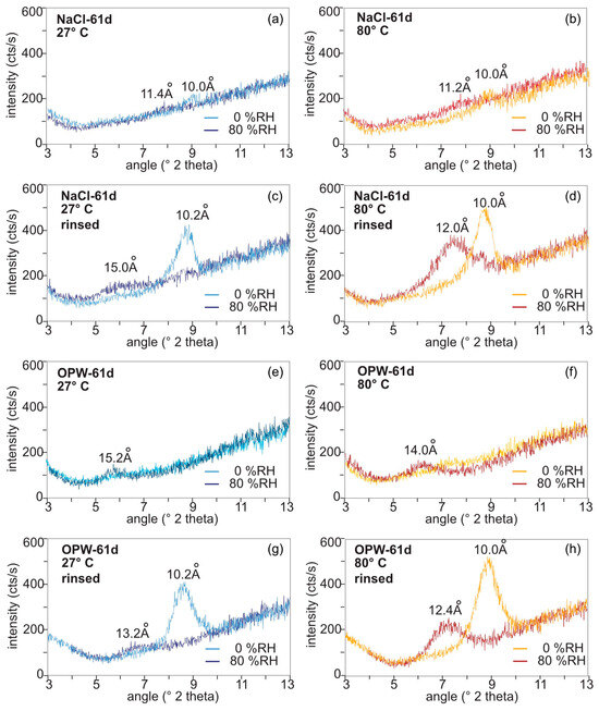 The NaCl-saturated samples at 27 °C showed a shift of the d001 value from 10.2 Å (8.7 °2theta) at 0% RH to 15.0 Å (5.9 °2theta) at 80% RH (ca. 15 wt% water; Figure 4c). At 80 °C, a shift from 10 Å (8.8 °2theta) at 0% RH to 12.0 Å (7.35 °2theta) at 80% RH (ca. 7 wt% water; Figure 4d) was recognised. This reflects a loss of interlayer water to a minimum of 9 wt%. After incubating bentonite in OPW for 61 days, the water intake into the smectite interlayers was reduced in comparison to NaCl (Figure 4g,h). At 27 °C, the d001 value shifted from 10.2 Å (8.7 °2theta) at 0% RH to 13.2 Å (6.7 °2theta) at 80% RH (ca. 10 wt% water; Figure 4g). At 80 °C, the d-value shift ranged from d001 10.0 Å at 0% RH and 12.4 Å (7.25 °2theta) at 80% RH (ca. 8.7 wt% water; Figure 4h).