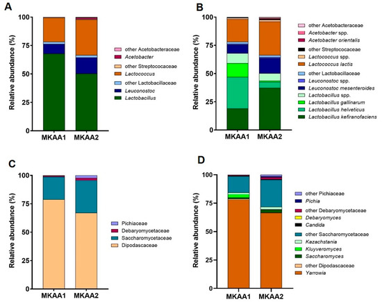Relative abundance of the dominant bacterial genera (A) and species (B) as well as fungal families (C) and genera (D) from communities in the metatranscriptome of MKAA1 and MKAA2 kefir.