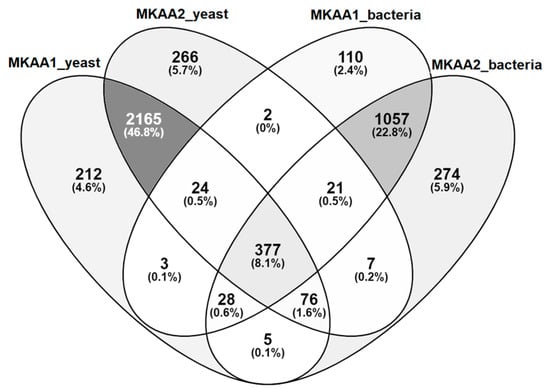 Regarding KEGG PATHWAY mapping of the KO functional orthologs, there were 1622 and 1845 assigned KO entries in MKAA1 and MKAA2 bacteria libraries, respectively, out of a total of 1984 unique KO, and 2890 and 2938 assigned KO entries in yeast libraries, respectively, out of a total of 3186 unique KO. Both kefirs shared 74.7% of bacteria KO and 82.9% of yeast KO (Figure 3). KO found in only one kefir in the bacterial and fungal libraries were 7% and 7.8% in MKAA1 and 18.2% and 9.3% in MKAA2, respectively.