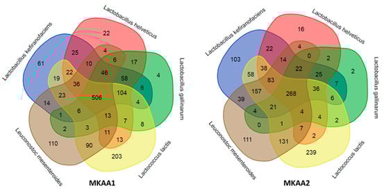 The species pair L. helveticus and L. gallinarum participated with 934 KO in MKAA1 and then dropped to 590 KO in MKAA2 (37% less), with a subsequent increase from 520 to 838 KO absent in both. Of these KO in MKAA1 and MKAA2, 757 and 361 were shared with at least one other lactic acid bacteria: 506 and 268 KO with the other three lactic acid bacteria, 104 and 36 with L. kefiranofaciens and Lc. lactis, 58 and 25 with L. kefiranofaciens only, 46 and 22 with L. kefiranofaciens and Leu. mesenteroides, 17 and 2 with each other, 13 and 4 with Lc. lactis and Leu. mesenteroides, 7 and 4 with Lc. lactis only, and 6 and 0 with Leu. mesenteroides only, respectively (Figure 4).