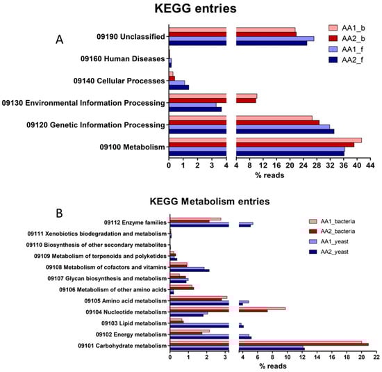 Concerning the top six categories for KEGG Pathway mapping (Figure 5A), the relative abundances of reads associated with “Metabolism” and “Genetic Information Processing” in bacteria and yeast are majorities, and others 23 to 29% were categorised as “Unclassified”. Only slight differences were observed in the total KO between bacteria and yeasts. Concerning the second-level categories under the top category “Metabolism” (Figure 5B), the relative abundance of transcripts associated with “Carbohydrate metabolism” was higher in bacteria than in yeasts (20% vs. 12%), also observed with “Nucleotide metabolism” (9% vs. 2%) and “Metabolism of other amino acids” (1.2% vs. 0.2%). Otherwise, yeasts showed a higher relative abundance of transcripts associated with “Energy metabolism” (5% vs. 2%), “Lipid metabolism” (4% vs. 0.8%), “Aminoacid metabolism” (4.5% vs. 3%), “Metabolism of cofactors and vitamins” (2% vs. 1%), and “Enzyme families” (6% vs. 2.5%).