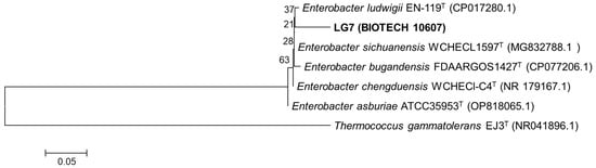 The closest reference type strains for LG7 were summarized in the phylogenetic analysis and were strengthened by using an outgroup (Thermococcus gammatolerans EJ3) (Figure 1). In parallel with the biochemical identification, LG7 was classified as Enterobacter sp. using 16S rRNA gene sequencing.