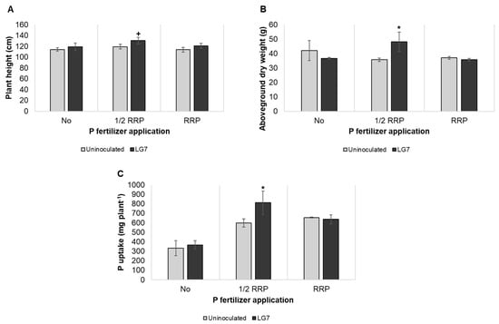 Plant growth promotion of LG7 on rice ‘NSIC Rc222’ at eight weeks after sowing. Plant length (A), Aboveground dry weight (B), P uptake (C). Significant differences between uninoculated and LG7 were determined by Dunnett’s test (* p < 0.05; + p < 0.10). The error bar indicates the standard deviation of three replications.