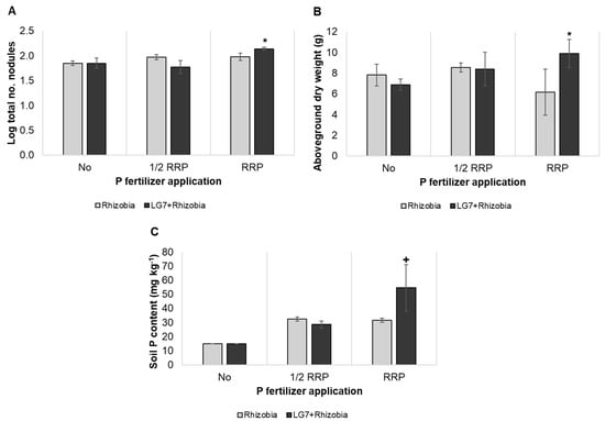 Plant growth promotion and post-harvest soil P content of combined LG7 and rhizobia inoculant on peanut ‘Biyaya’ at six weeks after sowing. Total nodule number (A), Aboveground dry weight (B), soil P content (C). Significant differences between rhizobia alone and LG7 + rhizobia were determined by Dunnett’s test (* p < 0.05; + p < 0.10). The error bar indicates the standard deviation of four replications.