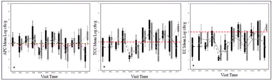 Overall, there were no significant differences in the mean APC, ECCs, TCCs, and ECs between halal and non-halal samples across the 12 months. However, individual comparisons of each visit (n = 12/market) showed a significant difference (p < 0.001) in the APCs, TCCs, and ECs between halal and non-halal samples during the October 2017 visit (Figure 3), where non-halal samples yielded higher levels of indicator microorganisms than halal samples.