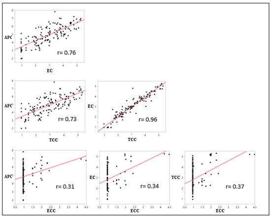 Significant correlations between all pairs of indicators are shown in Figure 4. The highest positive correlations were found between the log CFU/g of EC and TCC (r = 0.96), APC and EC (r = 0.76), and APC and TCC (r = 0.73). The presence or absence of generic E. coli in the samples was best predicted by the level of total coliforms, followed by the level of Enterobacteriaceae.