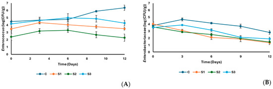 The number of Enterococci (Figure 2A) was between 2.40 and 4.18 log CFU/g on the first day. The Enterococci count showed an increasing trend in sample C and a decreasing trend in samples S1, S2, and S3 during ripening. The counting pattern was similar to those of TAMB and CNC. At the end of the manufacturing process, the highest count of Enterococci was determined in the non-cultured samples with 6.37 log CFU/g, followed by S3 with 4.28 log CFU/g. On the other side, L. sakei inoculation caused a significant decrease in Enterococci (p < 0.05) at the end of production.