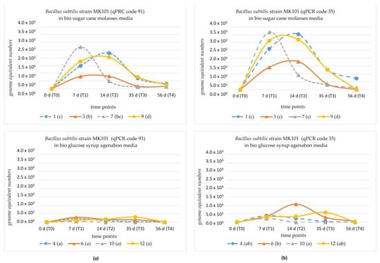 Genome equivalent numbers of Bacillus subtilis strain MK101 at the different time points. The lines show the different variants according to Table 1. Different letters in the variant name represent significant differences between measured qPCR values. The qPCR assays code 91 and code 35 were analysed separately: qPCR assay code 91 analysis (a); and qPCR assay code 35 analysis (b) (n = 5).