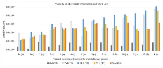 We also measured the viability of the bacteria at all time points during fermentation and storage by cultivating dilution series on 10% tryptic soy broth agar plates. Group a, which represented variants with low viability, was formed from variants 14, 13, two, seven, nine, six, eight, five, and three. Group b (variant 11) and group c (variants ten and one) showed middle viability. High viability was determined in variant 12 (group d) and the highest in variant four (group e) (Figure 2).