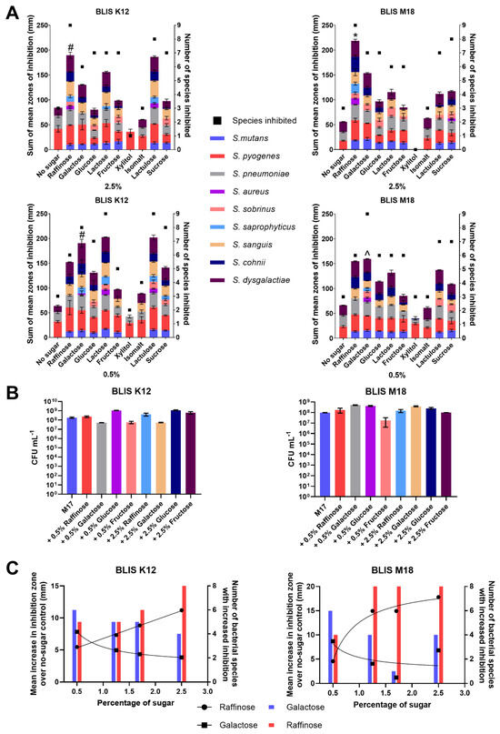 (A) Sum of the mean zones of inhibition for different sugars (left Y-axes, Bars) and the number of species inhibited (right Y-axes, square points) for BLIS K12 and BLIS M18 at both 2.5% (w/v) and 0.5% (w/v) of different sugars (Data points are mean (n = 3, ±SD). For the sum of the average mean zones of inhibition, a two-way ANOVA with Dunnett’s multiple comparisons tests compared raffinose in the 2.5% samples and galactose in 0.5% to the other sugars was completed. * = p < 0.05 for all sugars, # = p < 0.05 for all sugars except lactulose and lactose and ^ = p < 0.05 for all sugar except raffinose. (B) Mean growth of BLIS K12 and BLIS M18 in M17 media supplemented with different types and concentrations of sugars after 18 h. (n = 3, ±SD). (C) Dose response of raffinose and galactose at different concentrations measuring the mean increase in zones of inhibition and number of species of bacteria inhibited compared to a non-sugar control across S. constellatus T29, S. salivarius K34b, S. pyogenes 71-698, S. mutans OMZ175, S. pneumoniae D39, S. saprophyticus ATCC 13505, S. aureus A222, S. sobrinus OMZ176. Lines with dots represent the mean increase in the size of the inhibition zone with a line of non-linear fit (left Y axes) and bars represent the number of species inhibited (right Y axes).