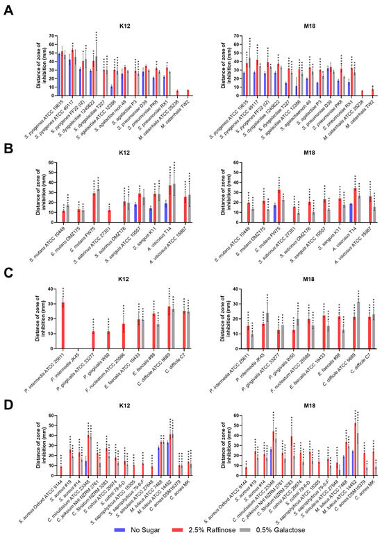 Size of the inhibition zone for BLIS K12 and BLIS M18 on CABCa agar plates, containing 2.5% (w/v) raffinose or 0.5% (w/v) galactose or no sugar, across a range of bacterial species and strains associated with (A) pharyngitis, otitis media, pneumonia, and neonatal sepsis infections. (B) Teeth (C) periodontitis, halitosis, and gut (D) skin. Bars are means of biological replicates (n = 3, ±SD). (A–D) A two-way ANOVA with Dunnett’s multiple comparisons tests compared raffinose and galactose to the no sugar control. *, p < 0.05, **, p < 0.01, ***, p < 0.001, ****, p < 0.0001.