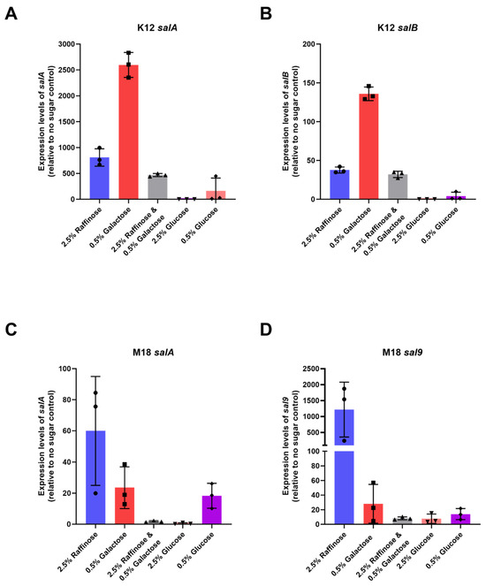 Mean expression levels of (A) salA (B) salB in BLIS K12 and (C) salA (D) sal9 in BLIS M18, when grown on CABCa agar medium supplemented with different sugars relative to a no sugar control. Bars represent mean values with individual values shown as symbols (n = 3, ±SD).