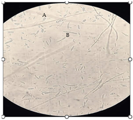 Morphological characteristics of F. sp. (A) Oval to kidney-shaped 162 microconidia; (B) sickle-shaped, thin-walled macroconidia.