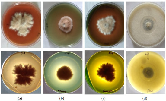 In vitro growth of Fusarium sp. on GYEA medium supplemented with (a) tannic acid (top and bottom view); (b) malachite green (top and bottom view); (c) bromocresol green (top and bottom view); and (d) lignin (top and bottom view).