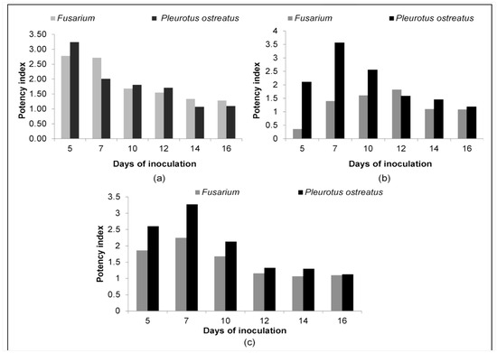 Potency index of Fusarium sp. and P. ostreatus MTCC 142 on GYEA medium containing tannic acid (a), malachite green (b), and bromocresol green (c).