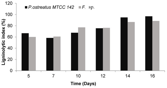 Besides observing the potency index, the present study also observed the ligninolytic index of the F. sp. and P. ostreatus MTCC 142 (Figure 4). However, P. ostreatus MTCC 142 showed the highest ligninolytic index of 97% on the 16th day of incubation, which was comparable to F. sp. which showed the maximum ligninolytic index of 89% on the 16th day of incubation. The ligninolytic index showed that both the cultures were able to produce ligninolytic enzymes and utilize lignin as carbon source.