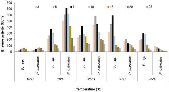 The versatile peroxidase (VP) activity of F. sp. and P. ostreatus MTCC 142 was recorded and compared over different temperature regimes i.e., 10–35 °C (Figure 5). The effect of the temperature on VP production has not been analyzed systematically, but it is considered that the optimal temperature range for growth is not certainly the optimum range for the expression of enzymes. In the F. sp., the VP activity increased with the increasing temperature until 25–30 °C, while the production at 10 °C was observed to be the lowest. The highest VP activity of 592 UL−1 was recorded at 30 °C on the 7th day after inoculation (DAI). In contrast, in P. ostreatus MTCC 142, the production of versatile peroxidase was favored by low temperatures (Figure 5).