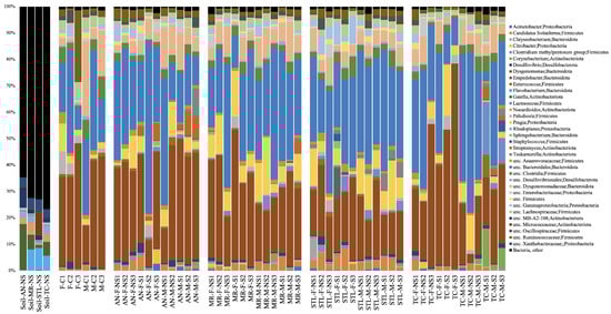 Taxonomical identification of the bacterial soil and control and soil-exposed cricket digestive tract communities at the genus level, based on 16S rRNA gene sequencing. AN, Angrignon park soil; MR, Mont-Royal park soil; STL, Saint-Laurent park soil; TC, Thomas-Chapais park soil; F-C, control adult female cricket; M-C, control adult male cricket; NS, non-sterilized soil; S, sterilized soil; F, adult female cricket; M, adult male cricket.