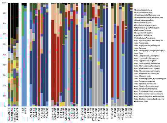Taxonomical identification of the eukaryote soil, and control and soil exposed cricket digestive tract communities, at the genus level, based on 18S rRNA gene sequencing. AN, Angrignon park soil; MR, Mont-Royal park soil; STL, Saint-Laurent park soil; TC, Thomas-Chapais park soil; F-C, control adult female cricket; M-C, control adult male cricket; NS, non-sterilized soil; S, sterilized soil; F, adult female cricket; M, adult male cricket.