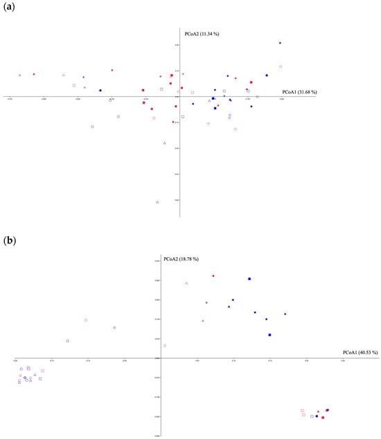 Principal coordinate analysis (PCoA) of the bacterial (a) and eukaryote (b) control and soil-exposed cricket digestive tract communities. Female adult crickets are in red, male adult crickets are in blue, control crickets are represented by stars, filled symbols are non-sterilized-soil-exposed crickets, open symbols are sterilized-soil-exposed crickets, circles are Angrignon park soil, squares are Mont-Royal park soil, diamonds are Saint-Laurent park soil, and triangles are Thomas-Chapais park soil.