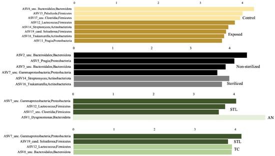 Linear discriminant analysis effect size (LEfSe) analysis of bacterial digestive tract community ASV abundance differences between control and soil-exposed crickets, non-sterilized- and sterilized-soil-exposed crickets, and crickets exposed to Saint-Laurent (STL), Angrignon (AN), and Thomas-Chapais (TC) park soils. The LDA score threshold was set at 3.5.