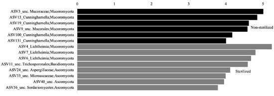 For the Eukaryote domain, unc. Mucoraceae, Cunninghamella, and unc. Mucorales were significantly higher in the non-sterilized-soil DT communities, while Lichtheimia, unc. Trichosporonales, unc. Aspergillaceae, unc. Microascaceae, and unc. Sordariomycetes were significantly higher in the sterilized-soil DT communities (Figure 5).