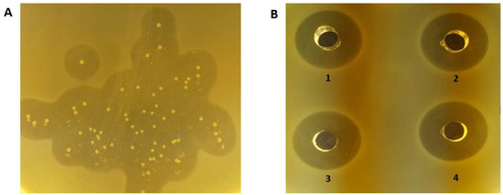 Strong enterocin-mediated inhibitory activity of four Enterococcus isolates from thermized sheep milk (TM2 batch sample) against the target strain Listeria monocytogenes no.10. (A) Direct in vitroantilisterial activity of the isolate KTM49 following growth of its colonies on M17 agar, overlaying them with a listerial cell lawn in TSAYE, and incubation of the plate at 30 °C overnight. (B) Agar well diffusion assay: Wells opened in a solidified TSAYE plate pre-seeded with listerial cells were filled with 60 μLof neutralized (pH 6.0–6.2) MRS CFS of the Enterococcus isolates KTM46 (well 1), KTM47, (well 2), KTM49 (well 3), and KTM55 (well 4), respectively.