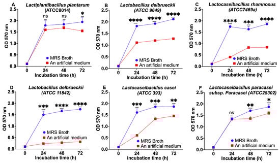 Growth curve analyses of 6 strains at 37 °C in MRS broth and artificial medium. Figure 2 compares the growth curves of 6 LAB strains cultured in MRS broth (blue circles) and a complete artificial medium (red squares) over 72 h of incubation. The horizontal axis represents time (hours, h), while the vertical axis depicts bacterial growth, measured as optical density (OD) at 570 nm (OD 570 nm). Panels (A–F) illustrate growth patterns for the following LAB strains: (A) Lactiplantibacillus plantarum (ATCC 8014), (B) Lactobacillus delbrueckii (ATCC 9649), (C) Lactocaseibacillus rhamnosus (ATCC 7469a), (D) Lactobacillus delbrueckii (ATCC 11842), (E) Lactocaseibacillus casei (ATCC 393), and (F) Lactocaseibacillus paracasei subsp. Paracasei (ATCC 25302). All of the experiments were repeated in triplicate. Significance was calculated by unpaired Student’s t-test; error bars indicate standard deviation; ns (not significant) for p > 0.05, * p < 0.05, ** p < 0.01, *** p < 0.001, **** p < 0.0001.