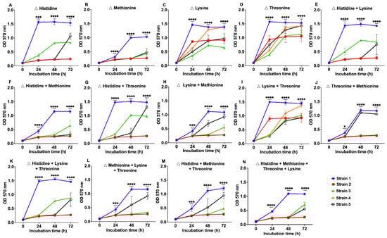 The effect of single, double, triple, and quadruple EAA omission on the growth of LAB strains in an artificial medium. Changes in OD 570 nm of each bacteria strain in media with single (A–D), double (E–J), triple (K–M), and quadruple (N) EAA omissions for culturing over the indicated time. Strain 1: Lactiplantibacillus plantarum (ATCC 8014); Strain 2: Lactobacillus delbrueckii (ATCC 9649); Strain 3: Lactocaseibacillus rhamnosus (ATCC 7469a); Strain 4: Lactocaseibacillus casei (ATCC 393); Strain 5: Lactocaseibacillus paracasei subsp. Paracasei (ATCC 25302). The symbol Δ indicates that a specific EAA was omitted from the artificial medium. Error bars show the SD. Data represent the mean ± SD from 3 independent experiments performed in triplicate. Statistical significance was assessed using a one-way ANOVA followed by Tukey’s multiple comparisons test, with the following significance thresholds: * p < 0.05, *** p < 0.001, **** p < 0.0001.