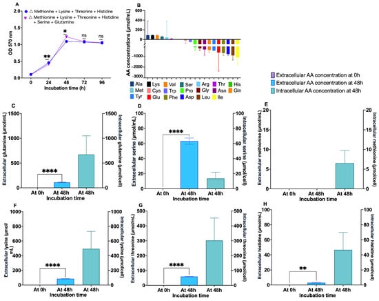 The effect of AA deprivation on growth and intracellular and extracellular AA concentrations in L. plantarum. (A) Growth curves of L. plantarum in 4 EAA-deficient artificial media (Δ methionine, Δ lysine, Δ threonine, and Δ histidine), with and without serine and glutamine. (B) Changes in the AA concentrations before and after 48 h cultivation of L. plantarum in the medium simultaneously lacking methionine, lysine, threonine, histidine, serine, and glutamine. (C–H) A quantitative comparison of the extracellular concentrations of AAs at 0 h (prior to inoculation with L. plantarum) and 48 h post-inoculation, alongside the analysis of intracellular concentrations of AAs at 48 h. Extracellular AA concentrations were normalized to the volume of the culture medium, while intracellular AA concentrations were normalized to the colony count in culture medium samples. Error bars show the SD. All of the experiments were repeated in triplicate. Significance was calculated by unpaired Student’s t-test; ns (not significant) for p > 0.05, * p < 0.05, ** p < 0.01, **** p < 0.0001. Ala (alanine), Arg (arginine), Asn (asparagine), Asp (aspartic acid), Cys (cysteine), Gln (glutamine), Glu (glutamic acid), Gly (glycine), His (histidine), Ile (isoleucine), Leu (leucine), Lys (lysine), Met (methionine), Phe (phenylalanine), Pro (proline), Ser (serine), Thr (threonine), Trp (tryptophan), Tyr (tyrosine), Val (valine).