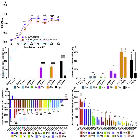 Effect of aspartic acid deprivation on growth and AA synthesis in L. plantarum. (A) Growth curve of L. plantarum with or without aspartic acid in medium simultaneously lacking methionine, lysine, threonine, histidine, serine, and glutamine (AA composition in the medium is shown in Figure 4B). The symbol ∆ indicates that a specific compound was omitted from the artificial medium. (B,C) Comparative analysis of extracellular AA (B) and intracellular AA concentrations (C) in 2 preparations of deficient artificial media, with (lacking 6 AAs) and without aspartic acid (lacking 7 AAs), at 48 h post-culture. Specifically, this measured the concentrations of the 6 AAs missing from the media. (D,E) Changes before and after 48 h cultivation of L. plantarum in the extracellular AA (D) and intracellular AA concentrations (E) between 2 deficient artificial media with (lacking 6 AAs) and without aspartic acid (lacking 7 AAs) at 48 h post-culture. Significance was calculated by unpaired Student’s t-test; error bar indicates the SD; ns (not significant) for p > 0.05, * p < 0.05, ** p < 0.01, **** p < 0.0001.