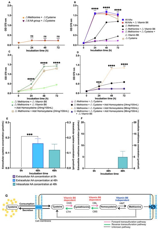 Methionine is an EAA universally required for the initiation of protein synthesis in all known organisms. Although methionine was undetectable extracellularly (Figure 4E and Figure 5B) and appeared at very low intracellular levels as determined by CE-MS (Figure 4E), we hypothesized that L. plantarum synthesizes methionine from cysteine via a series of enzymatic reactions, producing levels minimally sufficient to support cellular survival and proliferation. To elucidate the regulatory mechanisms governing methionine biosynthesis in L. plantarum, we initially excluded both methionine and cysteine from the artificial media, which led to a complete inhibition of L. plantarum growth (Figure 6A). Previous studies have indicated that vitamin B6 is a critical coenzyme for transsulfuration pathways [,]. To further investigate its role, we excluded the vitamin B6 components from the medium. While vitamin B6 deficiency did not affect the growth of L. plantarum in a medium containing all 20 proteinogenic AAs, it significantly impaired proliferation under methionine-deprived conditions, even in the presence of cysteine (Figure 6B). In media lacking methionine but supplemented with homocysteine (24 mg/100 mL), which serves as a precursor to methionine, L. plantarum demonstrated significantly enhanced growth compared to media without homocysteine supplementation (Figure 6C). Moreover, in the medium deficient in both methionine and cysteine, the addition of homocysteine (24 mg/100 mL) partially alleviated the growth impairment of L. plantarum under vitamin B6-deficient conditions (Figure 6D). Notably, increasing the concentration of homocysteine to 96 mg/100 mL fully restored the growth capacity of L. plantarum to levels observed in a methionine-deficient medium (Figure 6D). In concordance with these findings, cysteine accumulation was observed, while methionine was undetectable in the medium deprived of both cysteine and methionine, following supplementation with homocysteine (96 mg/100 mL) after 48 h of culture (Figure 6E,F). These results suggest that both cysteine and methionine are essential nutrients for L. plantarum optimal growth. This is likely attributable to the role of cysteine in the formation of disulfide bonds, which are crucial for proper protein folding, structural stability, and functional activity [].