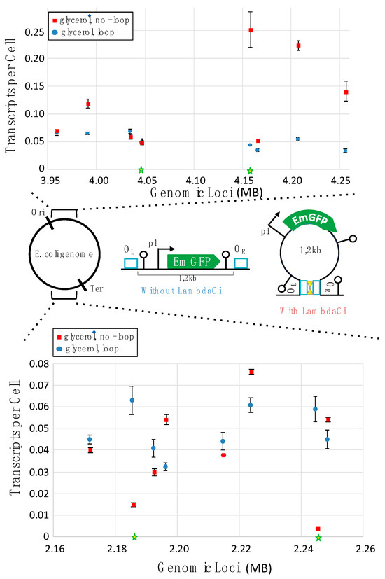 Considering that supercoiling is a major cause of context sensitivity and that supercoiling diffusion is prevented by DNA looping [26,33,34,35,36], we decided to evaluate the impact of looping on context sensitivity. To insulate our reporter cassette within a small loop in vivo, we used the lambda cI protein. This protein is known to efficiently bind specific DNA sequences (OR and OL) and self-dimerize to form a protein-bound DNA loop in vivo [59,60,61,62]. To express lambda cI, we engineered a strain that has, in its genome, the corresponding gene under the transcriptional control of the rhamnose inducible promoter. We confirmed that this strain expressed lambda cI in the presence of rhamnose using Western blot analysis (Figure S7). To allow for emGFP insulation in a loop, the reporter cassette was flanked by the lambda cI binding sites (Figure 1 and Figure 2). The impact of looping on emGFP transcription was then investigated in sixteen of the non-mutagenic insertion sites (eight in the Ori region and eight in the Ter region). The corresponding strains were constructed by transferring the reporter cassettes into the lambda cI expressing strain (α1). Transcription of emGFP was then quantified using RT-qPCR for strains grown in a medium containing glycerol as the carbon source and rhamnose as the inducer of DNA-loop formation.