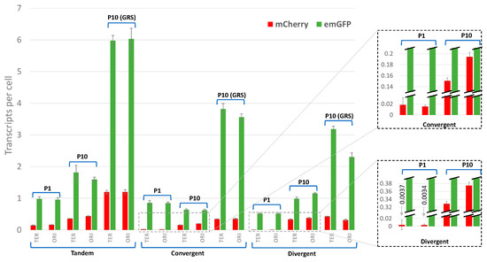 Gene transcription in natural genomes depends on the combined effects of intragenic regulatory determinants (promoter sequence, binding of transcription factors to operators…) and intergenic mechanisms depending on the genome layout (spatial arrangement and orientation of genes), PSB and transcriptional interference [3,63,64]. The level to which intergenic signals contribute to gene transcription control is still unclear. To investigate this issue, we used our synthetic biology approach to test the mutual impact that two transcribed genes have on their transcription in looped constructs. To that end, we inserted, in the cassette containing p3-emGFP flanked by the lambda cI binding sites (Figure 3a,b), a second reporter gene (mCherry) in three different configurations (Figure 4, top panel): (a) tandem—transcription is co-oriented; (b) convergent—the two genes transcribe into each other; and (c) divergent—transcription proceeds away from each other. These constructs have mCherry expressed from the weak p1 or a moderate (p10) promoter (note that p3 is about 3.5- and 8-fold stronger than p10 and p1, respectively (see [37] and above)). Both genes are directly followed by a strong terminator to prevent read-through transcription and transcription fork collisions. The constructs were then inserted into two different genomic locations (Ori and Ter regions) in the strain expressing lambda cI (α1) and were analyzed in loop formation conditions.