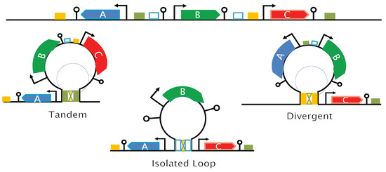 To understand the impact that topological domains have on context sensitivity, we used the lambda cI protein to incorporate the emGFP reporter cassette within a DNA loop (Figure 2). We found that the emGFP transcription is homogenized when incorporated within a loop, significantly reducing strain-to-strain variability. The control experiments using lambda cI mutants demonstrate that this effect depends on DNA loop formation. It is, however, important to note here that cI-mediated DNA loops can be destabilized by transcribing RNA polymerases [66]. To prevent such interferences, transcription terminators were cloned inside the loop at the 5′ and 3′ ends of emGFP, and most (10/16) of the constructs were inserted in non-transcribed regions (e.g., between the transcription terminator of a gene and the promoter of the downstream gene). However, transcription forks from upstream or downstream promoters may enter the looped region in six remaining strains (in these cases, the cassette was inserted few nucleotides downstream from an ORF or in a region containing “secondary” promoters). As the (potentially) transcribed and non-transcribed constructs gave similar results (e.g., high variability in the un-looped configuration and transcription homogenization in the looped configuration, Figure S9), elongating RNA polymerases from external promoters do not seem to significantly destabilize cI-mediated DNA loops in our study. Differences in transcription rates from external promoters may explain the apparent discrepancy between the two studies. In our work, these rates would be too low to significantly destabilize the loops and abrogate their effect on context sensitivity. In agreement with previous findings [27,33,34,35,36], we thus propose that the loop-induced protection from context sensitivity results from the ability of protein-forming loops to operate as topological barriers that prevent local supercoiling to interfere with gene transcription within the loop. The use of DNA loops can thus be extremely beneficial for synthetic biology projects, as it increases the predictable performance of synthetic circuits and biosynthetic pathways once inserted into the genome. It should, however, be kept in mind that our study focus on ≤2.5 kb loops while natural loops range 10–400 kb in size (see above). However, it was recently shown that all active transcription units form discrete topological barriers [25]. As the E. coli genome encompasses about 4000 transcription units [67], small loops of the size range of the synthetic loops investigated here may spontaneously form in E. coli.