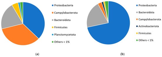 Most abundant bacterial phyla in mussel tissue in (a) 5.6 psu salinity and (b) 15 psu salinity.