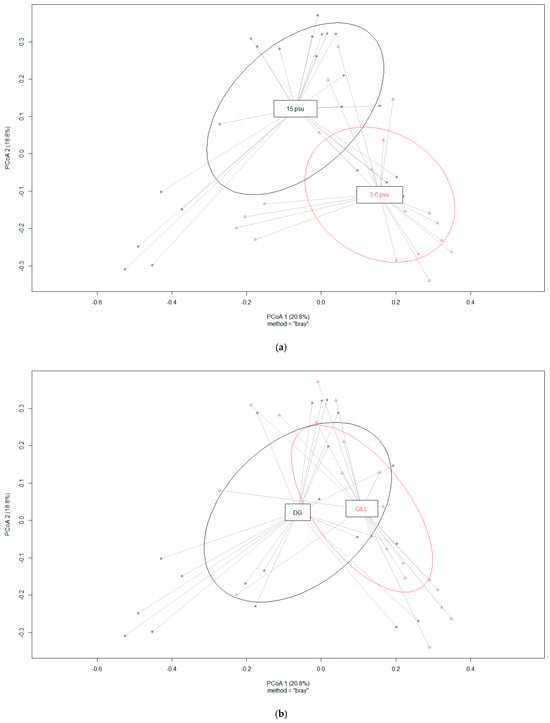 According to PERMANOVA results, bacterial community structure differed significantly in genus level between high and low salinity levels as well as between body locations (Figure 2a,b). At the same time, bacterial community Shannon diversity index values were not different between body locations or salinity levels. In the case of body locations, the following genera were differentially abundant—Flavobacterium (higher in GL) and Pseudomonas (higher in DG). Two salinity levels had an effect on the relative abundance of Colwellia and Flavobacterium (more abundant in low salinity) and Halomonas, Cellulophaga, and Polaribacter (more abundant in high salinity).