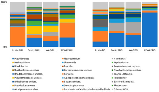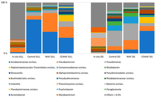 During the experiment Pseudomonas and Flavobacterium increased, especially in control and WAF incubations in DG samples. In CEWAF-exposed DG samples, unclassified Arcobacteraceae and unclassified Peptostreptococcales-Tissierellales increased, as did CEWAF gill samples (Figure 3). In CEWAF-exposed gill samples, the abundance of unclassified Arcobacteraceae and Flavobacterium notably increased, indicating a strong impact of the treatment on community structure. According to PERMANOVA results, the CEWAF treatment had a strong impact on the bacterial community structure of both gill and DG samples (p < 0.05). Unclassified Peptostreptococcales-Tissierellales (Firmicutes) increased notably in CEWAF treatments. In addition, Shewanella and unclassified Pseudomonadales increased (Figure 3).