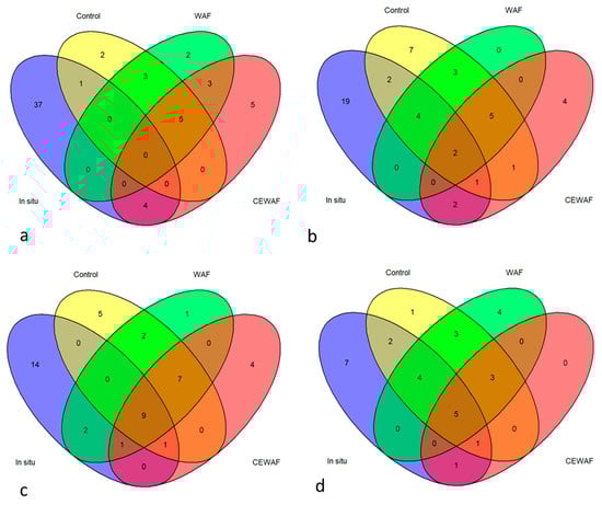 Venn diagrams showing the number of shared and unique genera between different treatments in low-salinity (a) gills and (b) digestive glands and high-salinity (c) gills and (d) digestive glands. Bacterial genera with a relative abundance greater than or equal to 0.5% were included in the analysis. Numbers in the overlapping regions indicate the number of shared taxa between samples. Blue: In situ, yellow: control, green: WAF and red: CEWAF.
