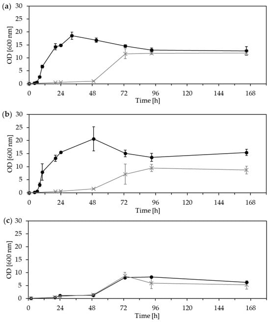 Growth curves of the yeast isolates Pichia kudriavzevii ZMUM_K002 (black line, ●) and Saccharomyces cerevisiae ZMUM_K003 (gray line, ×) in chemically defined media supplemented by different carbon sources: (a) glucose, 10 g/L; (b) fructose, 10 g/L; (c) sucrose, 10 g/L. The assay was performed in triplicate.