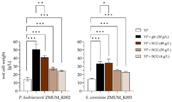 The growth of P. kudriavzevii ZMUM_K002 and S. cerevisiae ZMUM_K003 after 48 h of incubation, expressed as wet cell weight (WCW), varied depending on the supplementation of YP medium (Figure 3). In the absence of a carbon source, both strains exhibited minimal growth, with WCW values of 14.33 ± 2.06 g/L for P. kudriavzevii ZMUM_K002 and 14.53 ± 0.81 g/L for S. cerevisiae ZMUM_K003. The addition of glucose (20 g/L) resulted in the highest growth for both strains, with P. kudriavzevii ZMUM_K002 reaching 49.54 ± 4.21 g/L and S. cerevisiae ZMUM_K003 reaching 33.23 ± 2.46 g/L. When spent coffee ground solution was used as a carbon source, the highest WCW was observed at 40 g/L SCG, with P. kudriavzevii ZMUM_K002 and S. cerevisiae reaching 41.05 ± 2.60 g/L and 34.30 ± 4.80 g/L, respectively. Reducing the SCG concentration by half (to 20 g/L) resulted in moderate growth with WCW values of 27.12 ± 1.20 g/L for P. kudriavzevii ZMUM_K002 and 24.93 ± 1.13 g/L for S. cerevisiae ZMUM_K003, while the lowest SCG concentration (4 g/L) resulted in reduced growth, but not a linear decrease in growth with WCW values of 24.63 ± 1.10 g/L and 22.77 ± 1.83 g/L, respectively. The above stated differences were statistically significant, as shown by Student’s t-test (Figure 4).